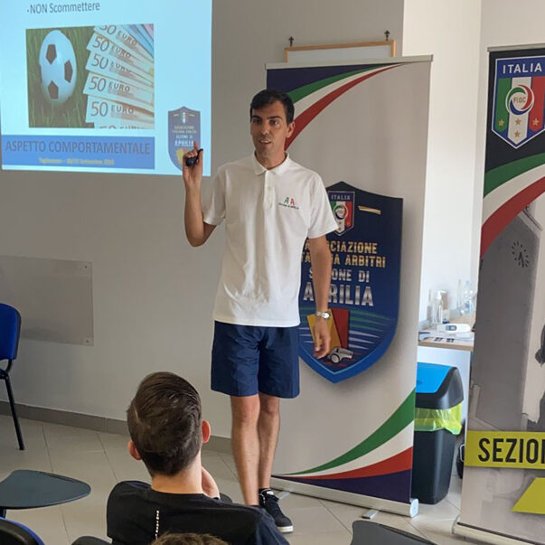 Nel pomeriggio, il Responsabile Regionale degli Osservatori Simone Innocenzi è venuto a far visita agli associati apriliani in rappresentanza del Comitato Regionale Arbitri, incitandoli soprattutto a ritrovare l’energia e la carica giusta per affrontare i campionati. Ha poi invitato i presenti a porsi degli obiettivi e a raggiungerli, sottolineando che con impegno e determinazione si possono raggiungere risultati molto alti. Dopodiché, sono stati mostrati dei video a cura del Settore Tecnico dell’AIA, focalizzando l’attenzione soprattutto sulla personalità e sul modo migliore di gestire una gara.