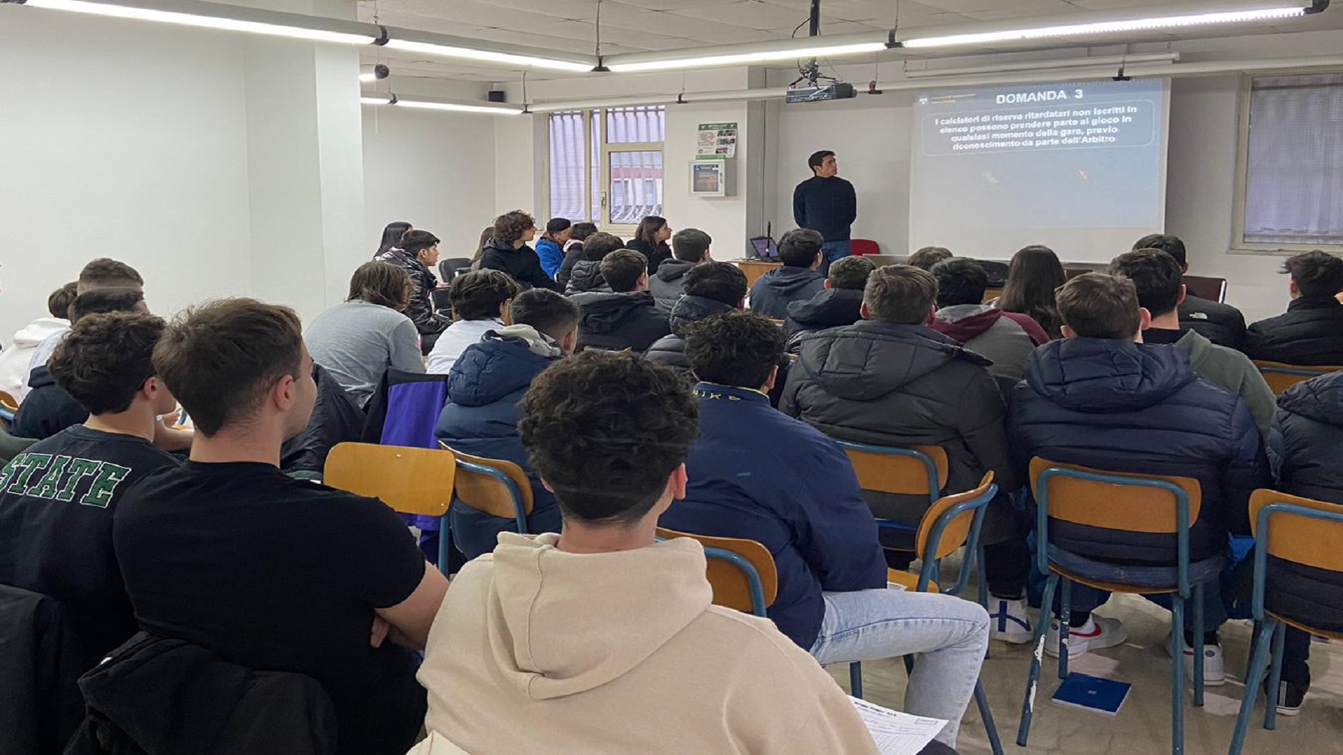 Un corso impegnativo iniziato in autunno con un capillare reclutamento in tutte le scuole superiori di Cassino registrando sin da subito ampia adesione. I nuovi locali sezionali hanno ospitato tutte le lezioni , ma si è andati anche oltre l’aula: domenica 22 gennaio infatti Andrea insieme al Presidente sezionale Marco Lamberti e altri componenti del Consiglio Direttivo hanno assistito insieme agli aspiranti direttori di gara ad una partita designata dall’Organo Tecnico Sezionale con l’obiettivo di dare consigli “pratici” a chi si sta affacciando a questa nuova attività.