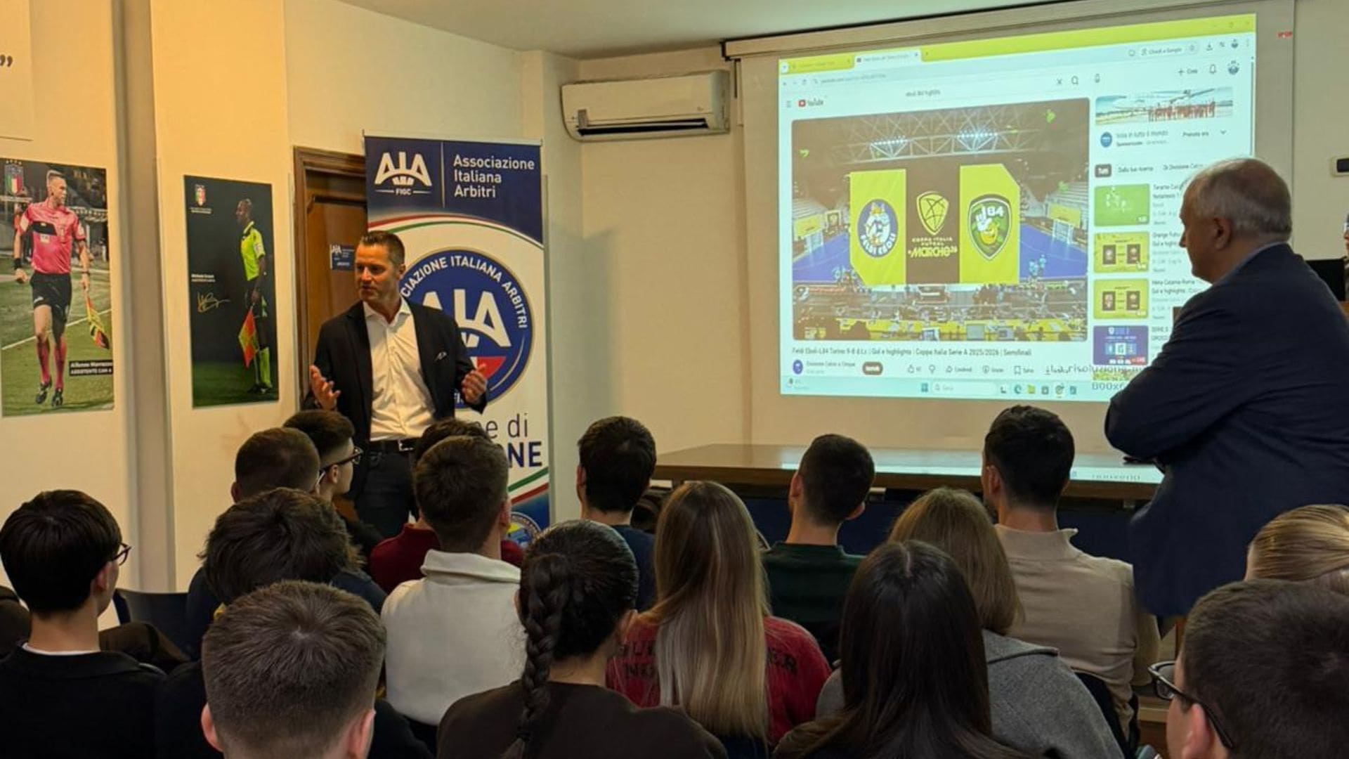 Dopo un video di benvenuto, Colombin ha condiviso la propria esperienza arbitrale, ripercorrendo inizialmente il suo percorso nel calcio a 11, culminato con il raggiungimento della massima categoria regionale. Successivamente, ha raccontato la scelta di intraprendere un nuovo cammino nel calcio a 5, che lo ha portato fino alla nomina di arbitro internazionale.