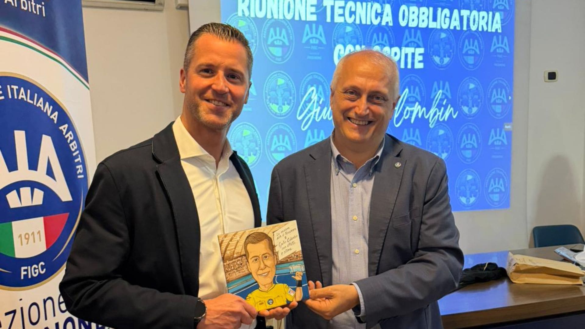 Al termine della riunione, la Sezione ha omaggiato l’ospite con una caricatura raffigurante l’arbitro in attività. Colombin ha ricambiato il gesto donando la propria divisa utilizzata nelle competizioni internazionali.
