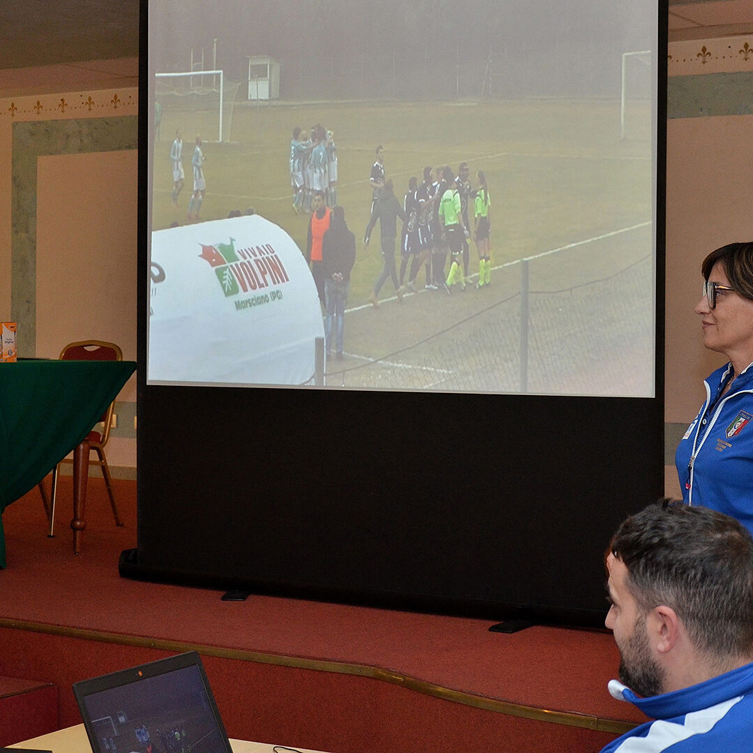 Dopo l’apertura dei lavori da parte dei due Presidenti e il Settore Tecnico, rappresentato dal Vice Responsabile Luca Ciancaleoni che ha sottoposto i quiz tecnici ai presenti. La mattinata è continuata con l’analisi di alcuni video con il supporto del Settore Tecnico su diversi temi, tra cui: “positioning”, “challenges”, “control”, “laws of the game”, “teamwork” e “offside”. “Lo spostamento sul terreno di gioco è molto importante – ha detto Ciancaleoni – farlo bene evidenzia una lettura tattica di spessore della gara. Occorre essere reattivi, pronti, allenati, brillanti, in movimento e scattanti. Dovete mantenere il controllo della situazione e mantenere un contatto visivo costante tra arbitro e assistente.”