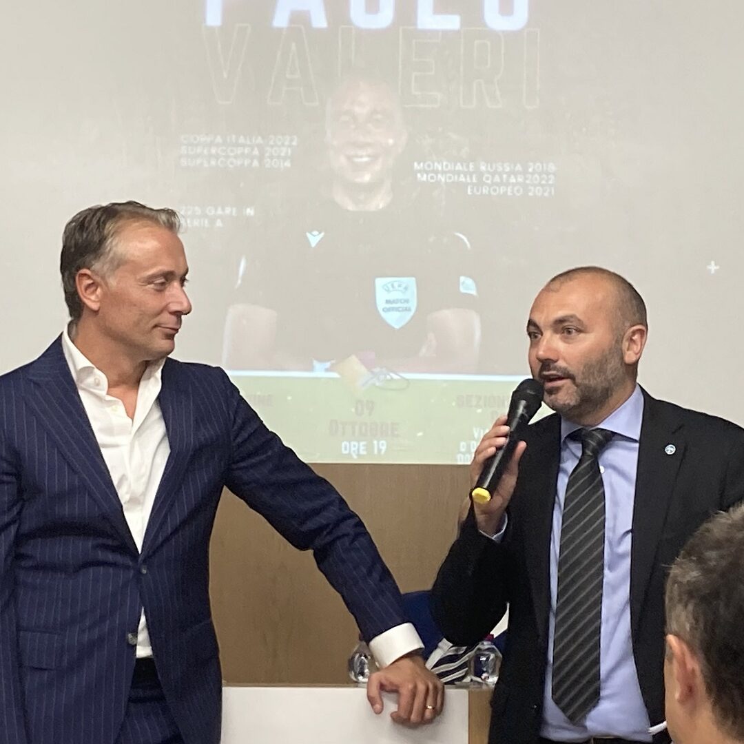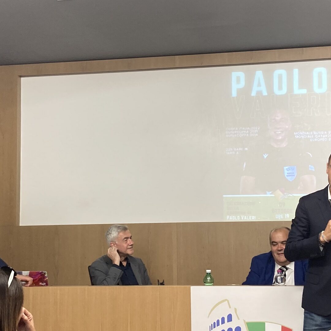 Non è semplice celebrare in una serata un’intera carriera sul terreno di gioco, tanto più se devono essere narrate le 225 gare in Serie A, due finali di Supercoppa Italiana, una finale di Coppa Italia oltre alle innumerevoli gare europee, in sala VAR ai Mondiali del 2018 e 2022, ad Euro 2020, in Coppa d’Asia e tanto altro. Ma è sicuramente più facile se a farlo sono uno scambio continuo di aneddoti, episodi ed emozioni di coloro i quali ne hanno accompagnato la sua vita. Con la guida di Federico Marchi, si sono avvicendati al microfono tanti associati, oltre al Presidente dell’Associazione Italiana Arbitri, Carlo Pacifici, al Vice Presidente Alberto Zaroli, al Componente del Comitato Nazionale Michele Affinito e al Presidente del Comitato Regionale Arbitri del Lazio Francesco Massini. È stata la festa di Paolo Valeri, l’Arbitro e l’Uomo.